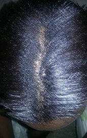 The hair is uprooted with scar tissue, caused by tight braids on prolong wears of sew in weave or braids